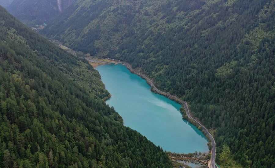 Aerial photo taken on Sept. 23, 2019 shows a view of Lake Xiniuhai in the Jiuzhaigou National Park in southwest China's Sichuan Province. (Xinhua/Wang Xi)