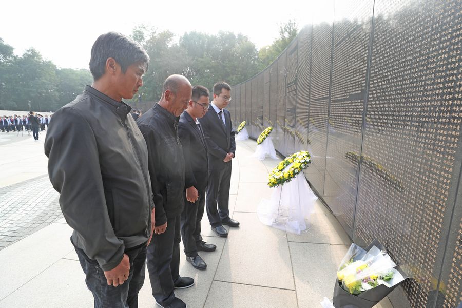 Relatives of martyr Xu Yuzhong mourn in front of the wall where Xu's name was carved at the cemetery of Korean War martyrs in Shenyang, capital of northeast China's Liaoning Province, Sept. 29, 2019. (Xinhua/Yang Qing)