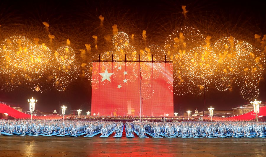 Fireworks explode during a grand evening gala marking the 70th founding anniversary of the People's Republic of China (PRC) in Beijing, capital of China, Oct. 1, 2019. (Xinhua/Jiang Wenyao)