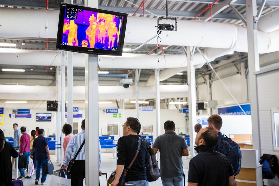 Passengers walk past a heat scan machine at Jomo Kenyatta airport in Nairobi, Kenya on May 13, 2018. (Xinhua/Lv Shuai)
