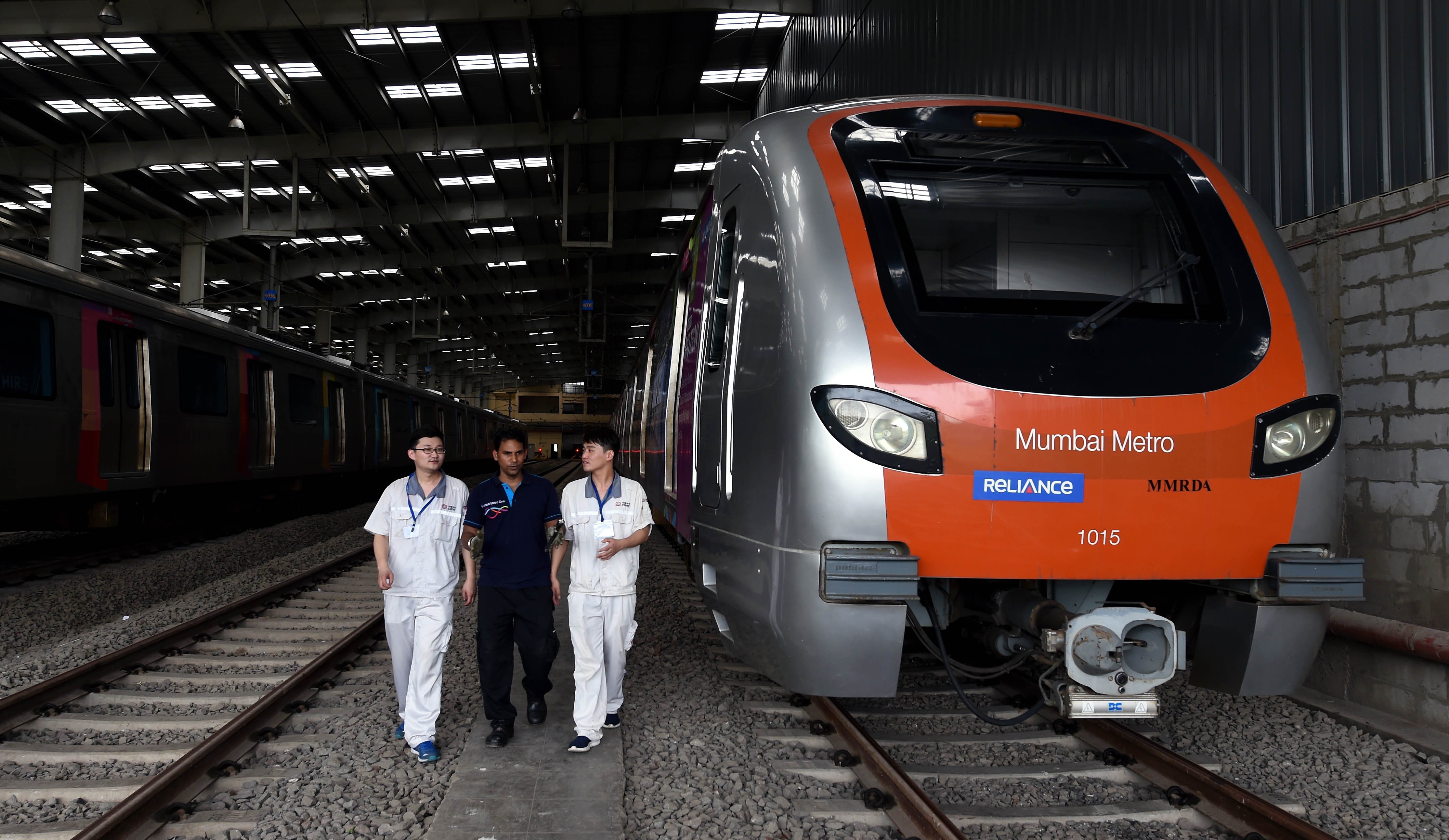 Chinese and Indian staff work at a metro car depot of Metro Line 1, in Mumbai, India, on June 27, 2018. Mumbai Metro Line 1 became operational on June 8, 2014, with its trains produced by China's CRRC Nanjing Puzhen Co., Ltd. (Xinhua/Zhang Naijie)