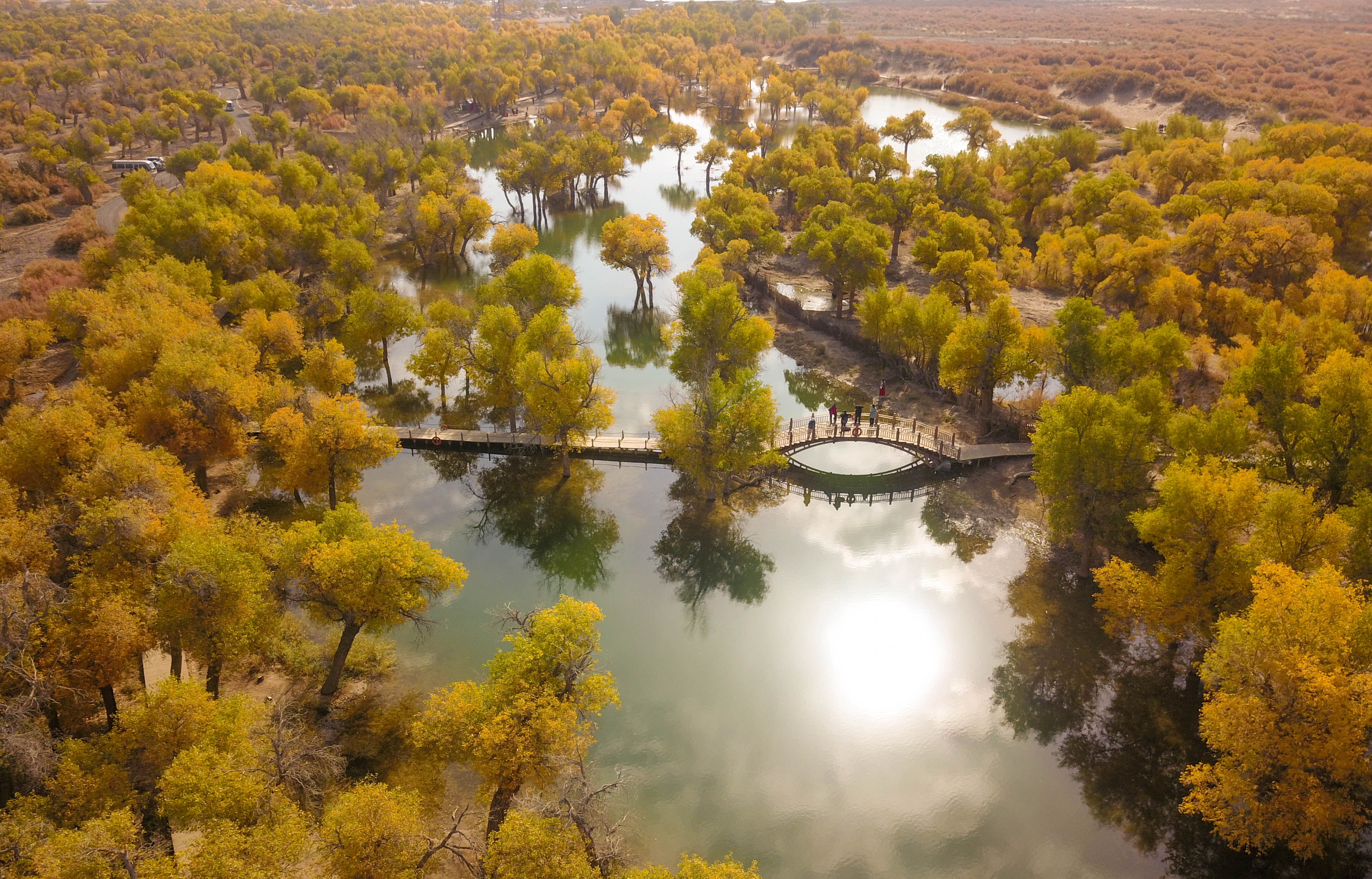 Aerial photo taken on Oct. 16, 2019 shows the autumn scenery of the populus euphratica forest in Ejin Banner, north China's Inner Mongolia Autonomous Region. (Xinhua/Peng Yuan)