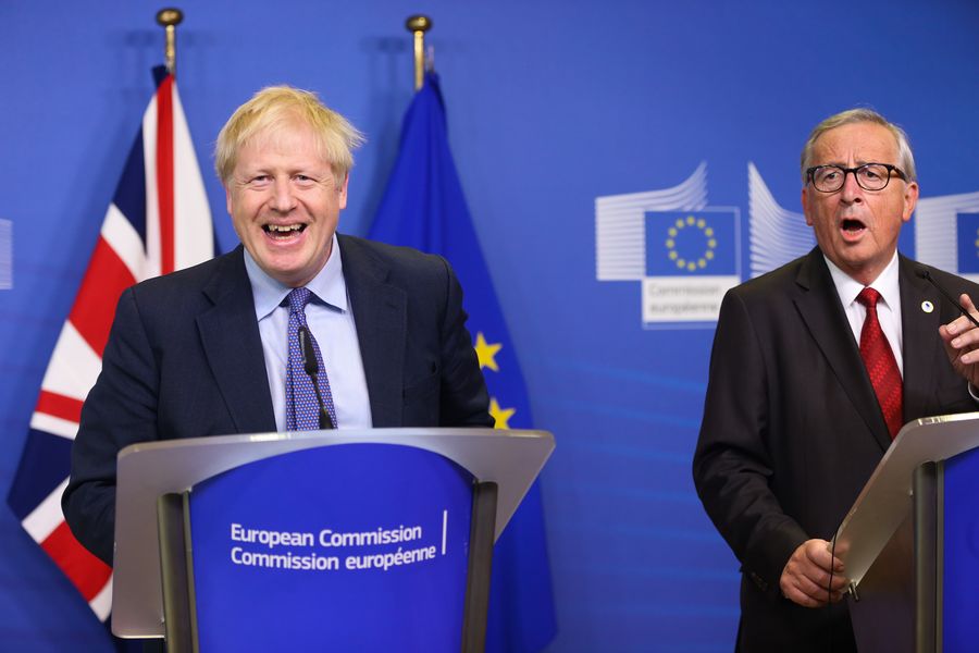 British Prime Minister Boris Johnson (L) and President of the European Commission Jean-Claude Juncker attend a press conference at the European Commission headquarters in Brussels, Belgium, Oct. 17, 2019.(Xinhua/Zheng Huansong)