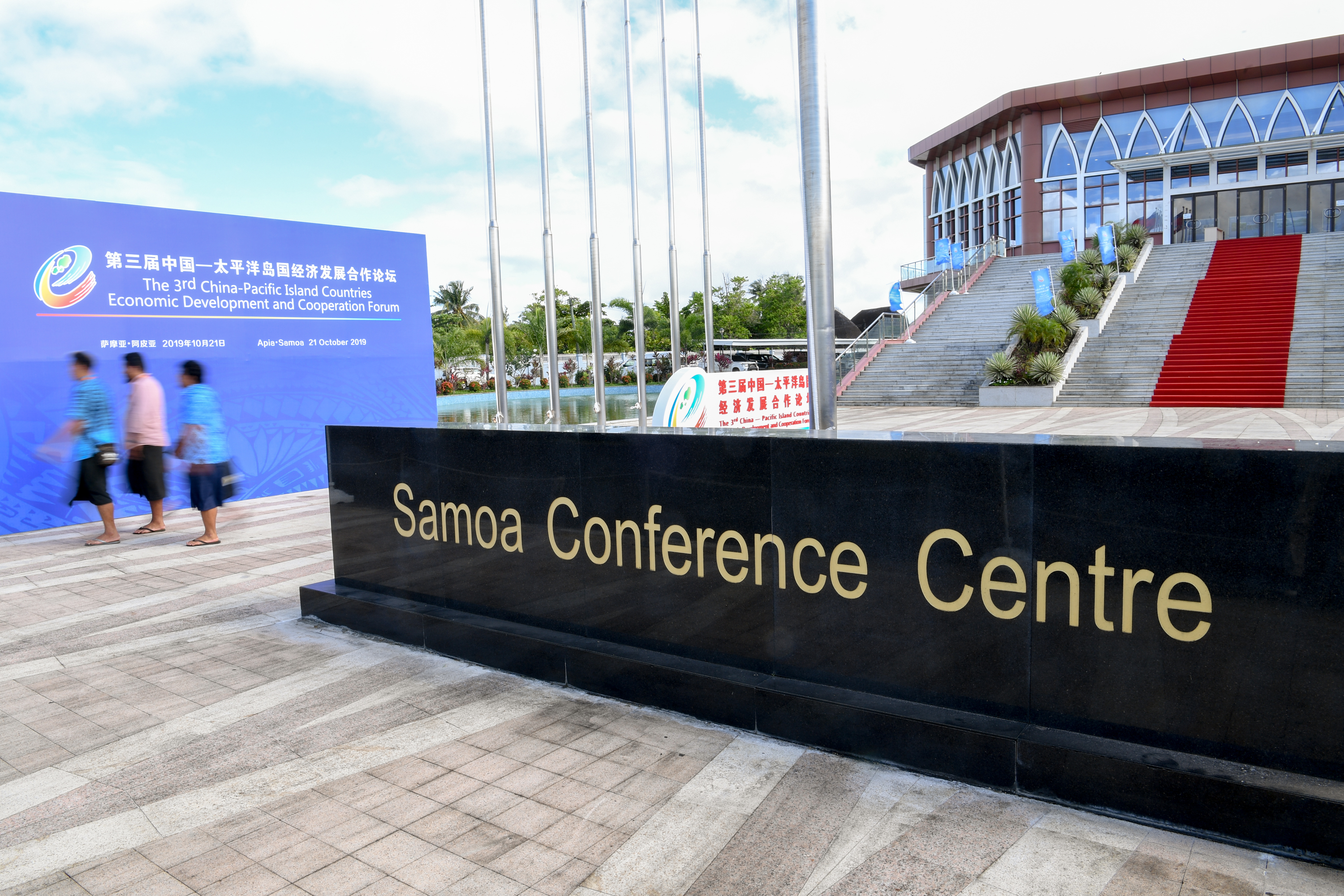 People walk past the Samoa Conference Centre, where the 3rd China-Pacific Island Countries Economic Development and Cooperation Forum is held, in Apia, Samoa, Oct. 21, 2019. (Xinhua/Guo Lei)