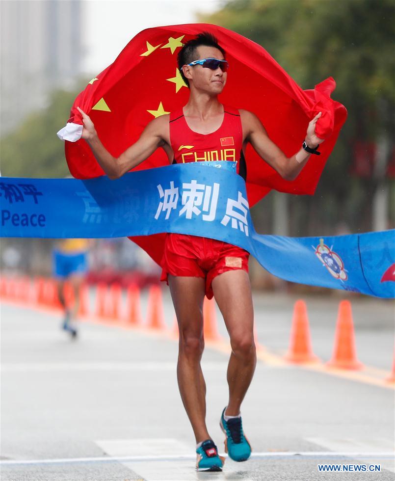 Wang Qin of China celebrates after men's 50km race walk final of track and field at the 7th CISM Military World Games in Wuhan, capital of central China's Hubei Province, Oct. 25, 2019. (Xinhua/Wang Lili)