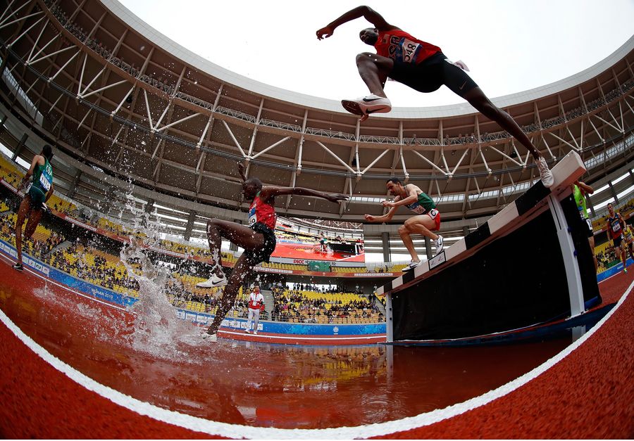 Frankline Tonui (up, R) of the United States competes in the men's 3,000m steeplechase preliminary round at the 7th CISM Military World Games in Wuhan, capital of central China's Hubei Province, Oct. 22, 2019. (Xinhua/Wang Lili)