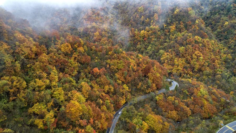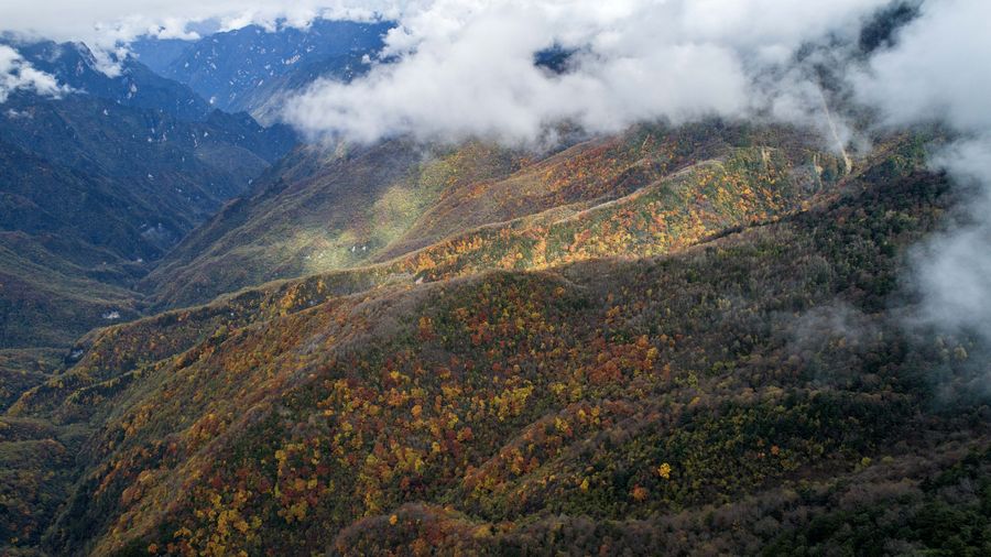 Aerial photo taken on Oct. 27, 2019 shows the autumn scenery of Shennongjia National Park, central China's Hubei Province. (Xinhua/Du Huaju)