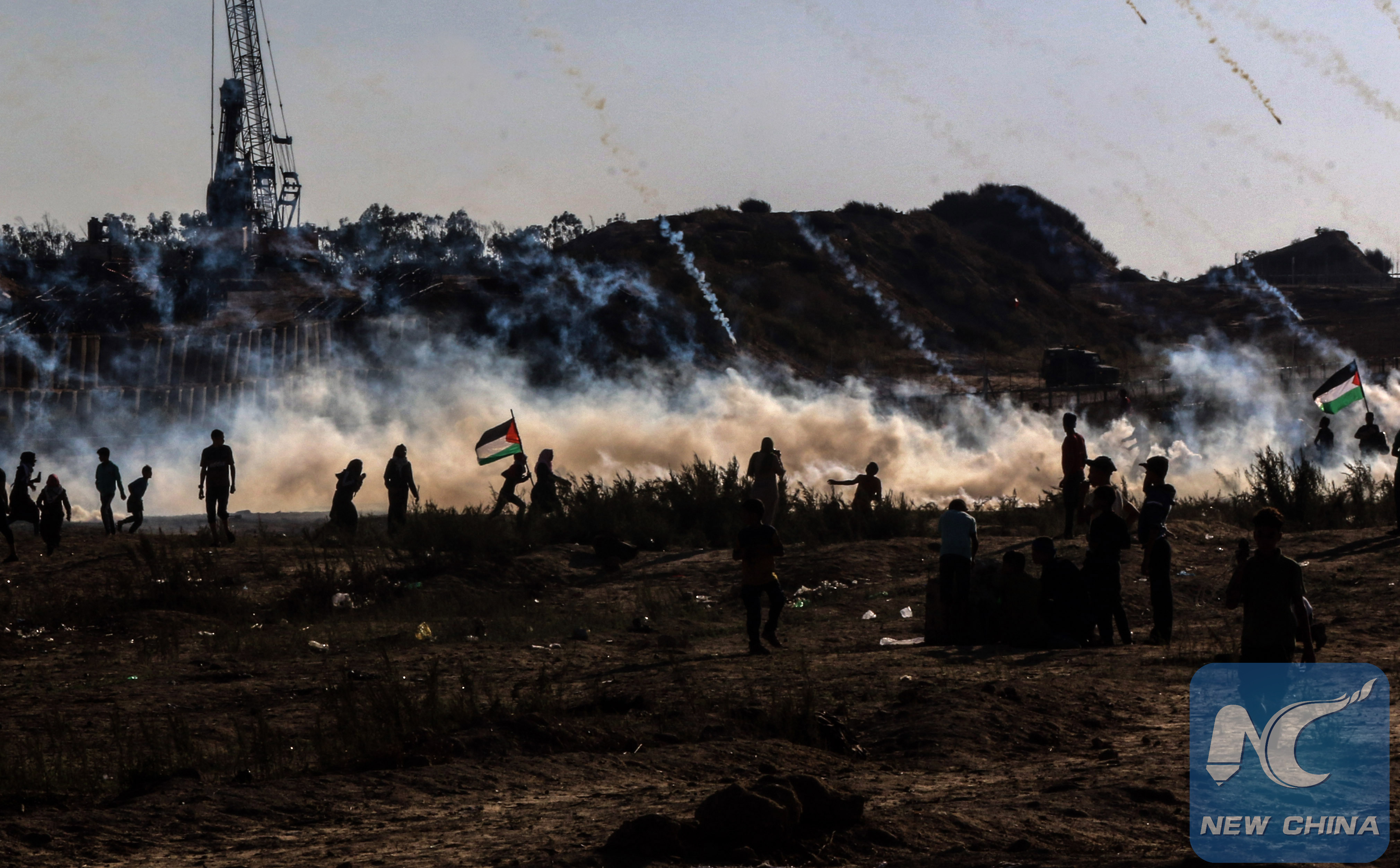 Palestinian protesters run to take cover from tear gas canisters fired by Israeli troops during clashes on the Gaza-Israel border, east of al-Bureij refugee camp in central Gaza Strip, Nov. 1, 2019. (Photo by Yasser Qudih/Xinhua)