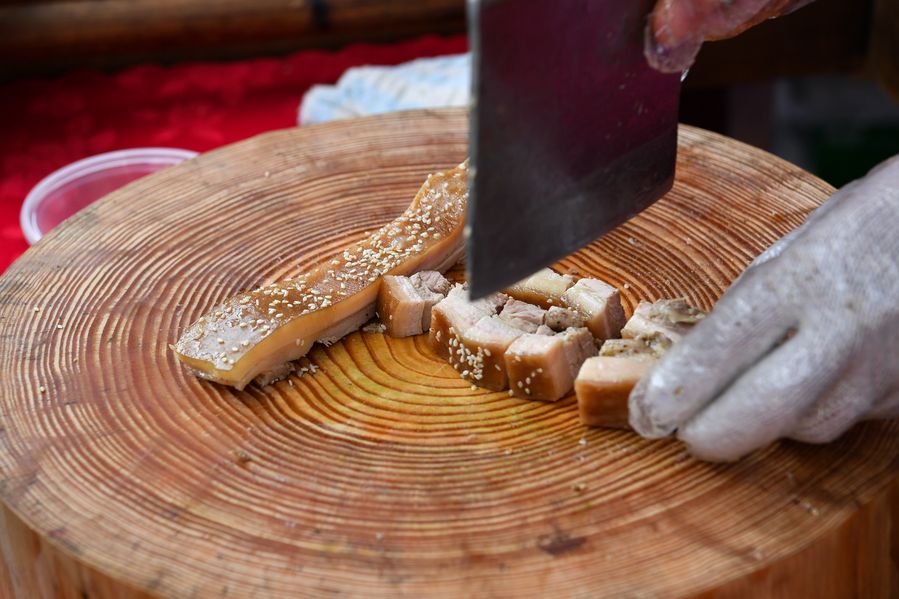 A cook prepares pork at the food culture week in Foshan, Nov. 1, 2019. (Xinhua/Liu Dawei)