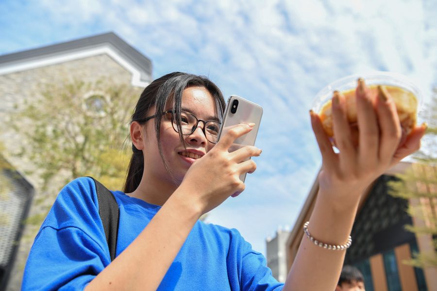 A woman takes photos of Douhua (Chinese snack made with very soft tofu) at the food culture week in Foshan, Nov. 1, 2019. (Xinhua/Liu Dawei)