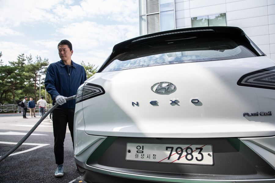 Photo taken on Oct. 22, 2019 shows a worker fueling a hydrogen fuel cell electric vehicle at the Eco-Technology Research Institute of Hyundai-Kia Motors in Yongin, South Korea. (Xinhua/Wang Jingqiang)