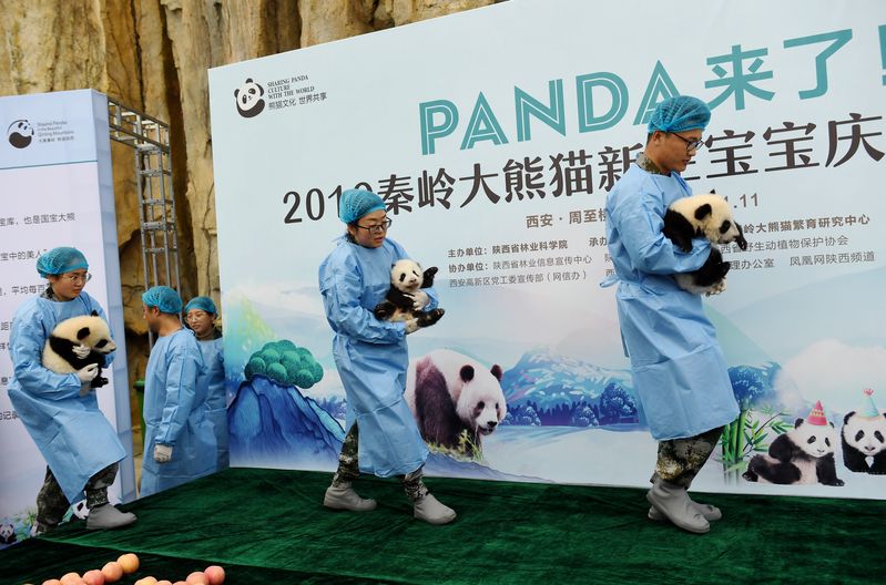 Three panda cubs including a pair of twins make their first appearance at the Qinling Research Base of Giant Panda Breeding of Shaanxi Academy of Forestry on Nov. 11, 2019. (Xinhua/Li Yibo)