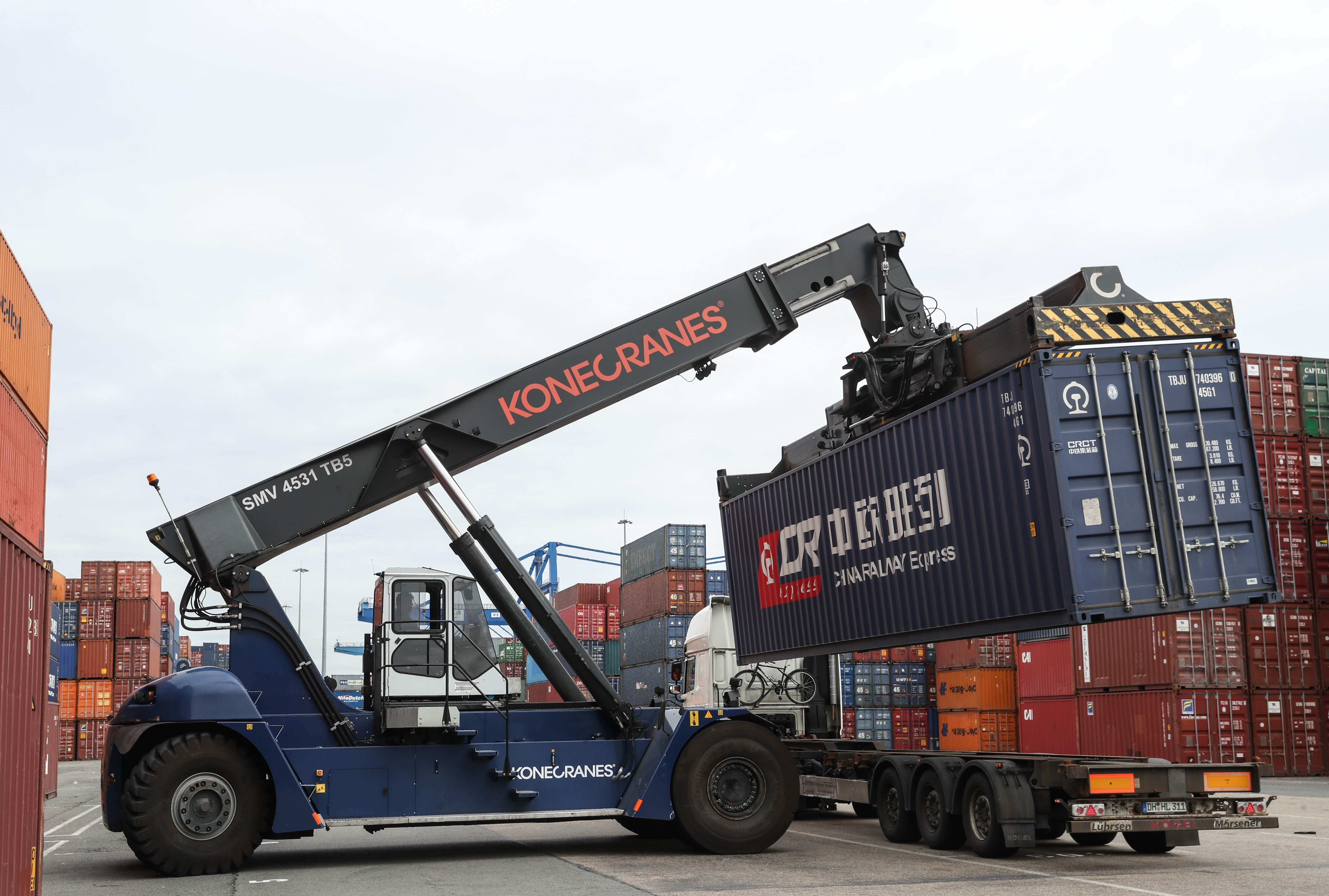 Photo taken on April 11, 2017 shows a cargo of China Railway Express being moved at Duisburg Intermodal Terminal (DIT) in Duisburg, western Germany. (Xinhua/Shan Yuqi)