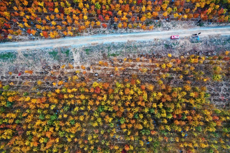 Aerial photo taken on Nov. 6, 2019 shows the autumn scenery of forest in Xiongan New Area, north China's Hebei Province. (Xinhua/Xing Guangli)