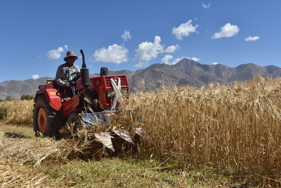 A reaper harvests highland barley in Zijin township of Gyangze County in Xigaze, southwest China's Tibet Autonomous Region, Sept. 26, 2019. Local farmers were busy with their work in harvest season of highland barley. (Xinhua/Zhou Jinshuai)