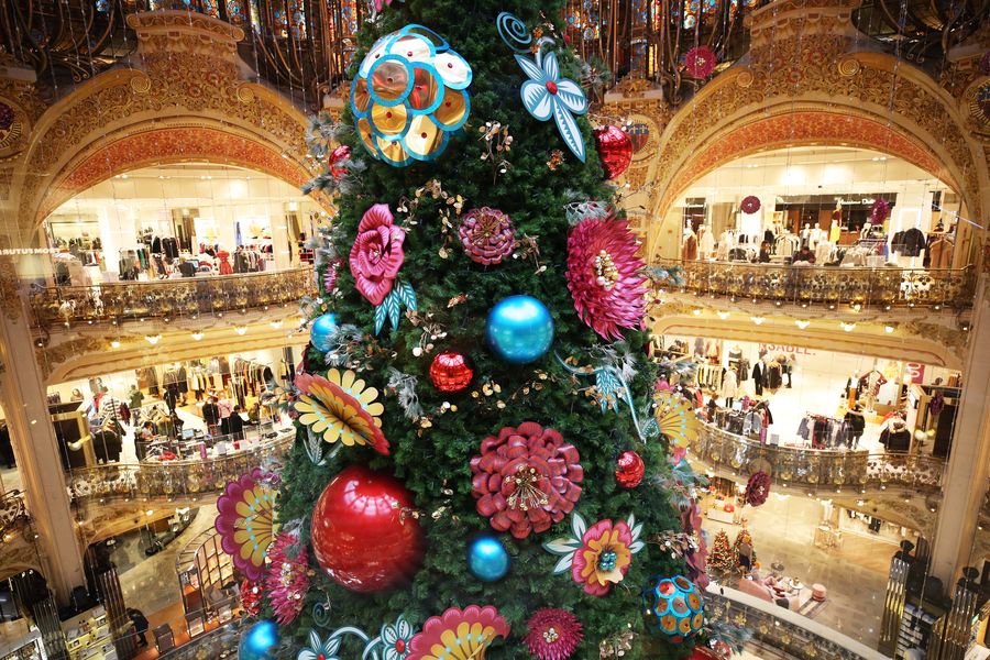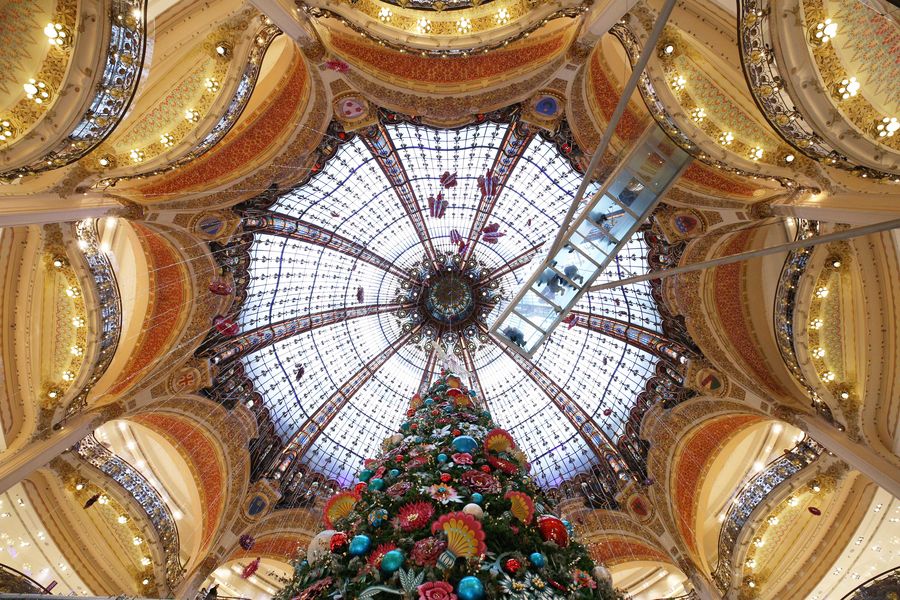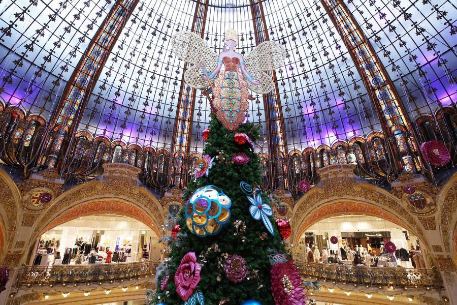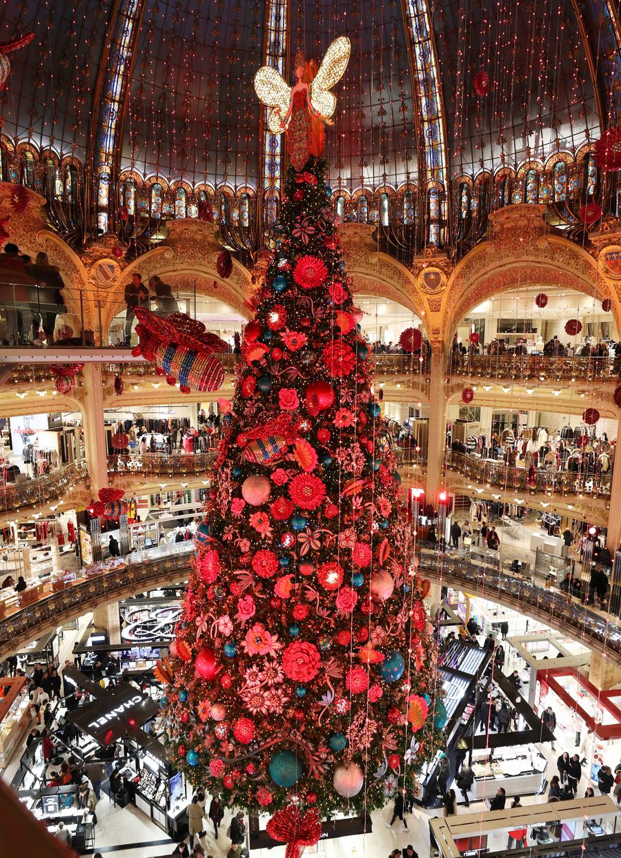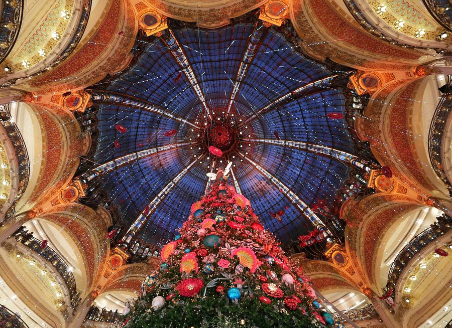 A giant Christmas tree stands at the Galeries Lafayette department store for the festive season. (Xinhua/Gao Jing)