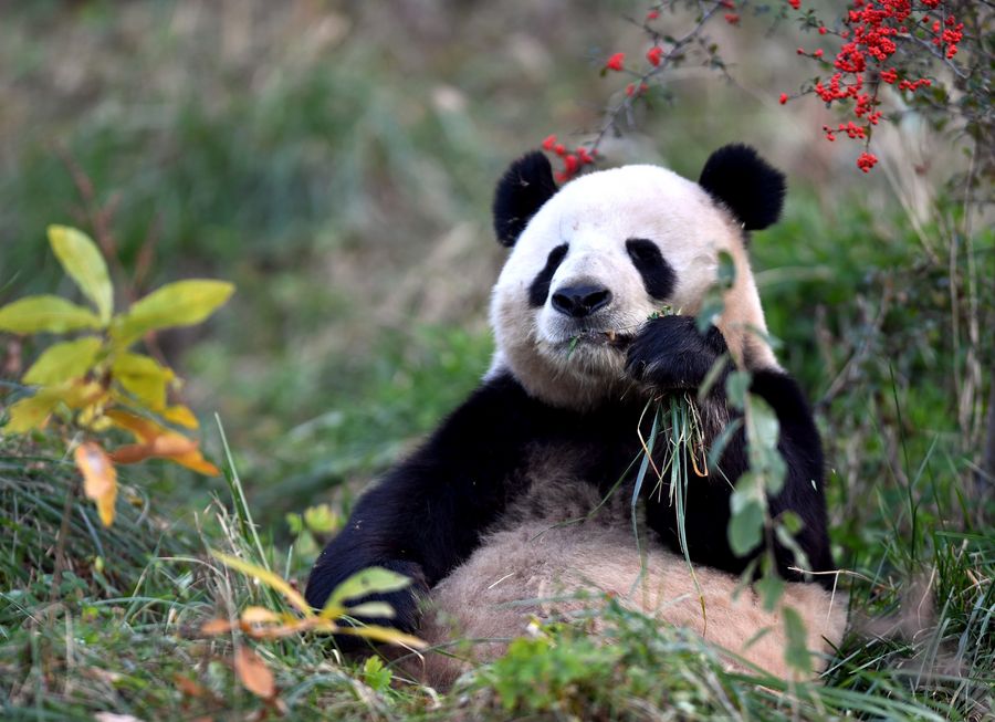 Giant panda Qiao Qiao eats at Qinling Research Base of Giant Panda Breeding of Shaanxi Academy of Forestry in Xi'an, Dec. 3, 2019. (Xinhua/Zhang Bowen)