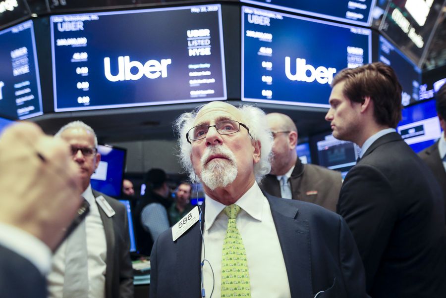 Traders work at the New York Stock Exchange during the initial public offering (IPO) of Uber Technologies Inc., in New York, the United States, May 10, 2019.
