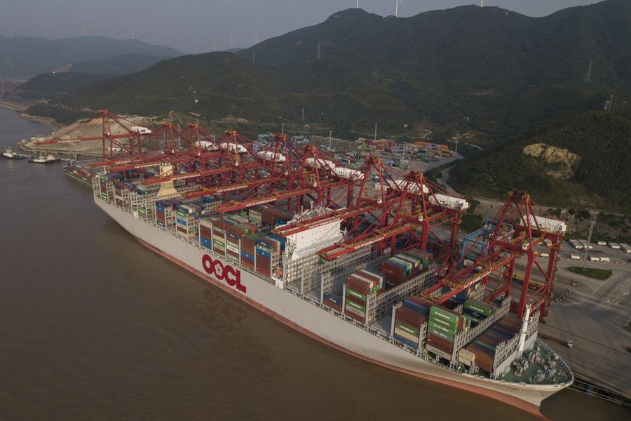 Aerial photo taken on June 13, 2018 shows a cargo vessel at Chuanshan port zone of Ningbo Zhoushan Port, east China's Zhejiang Province. (Xinhua/Huang Zongzhi)