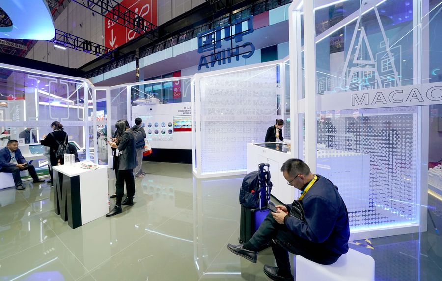 People visit the Macao exhibition area at the China pavilion during the second China International Import Expo (CIIE) in Shanghai, east China, Nov. 7, 2019. (Xinhua/Chen Jianli)
