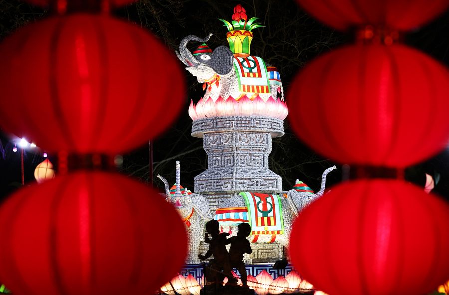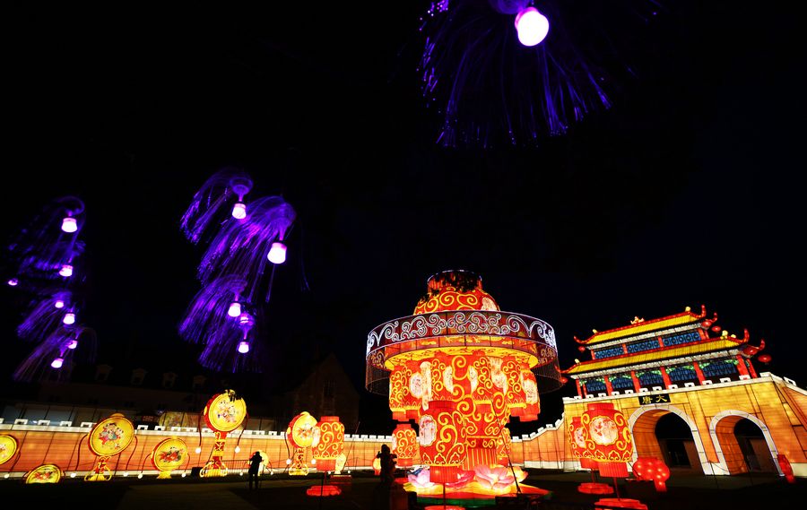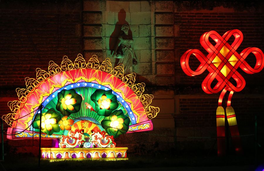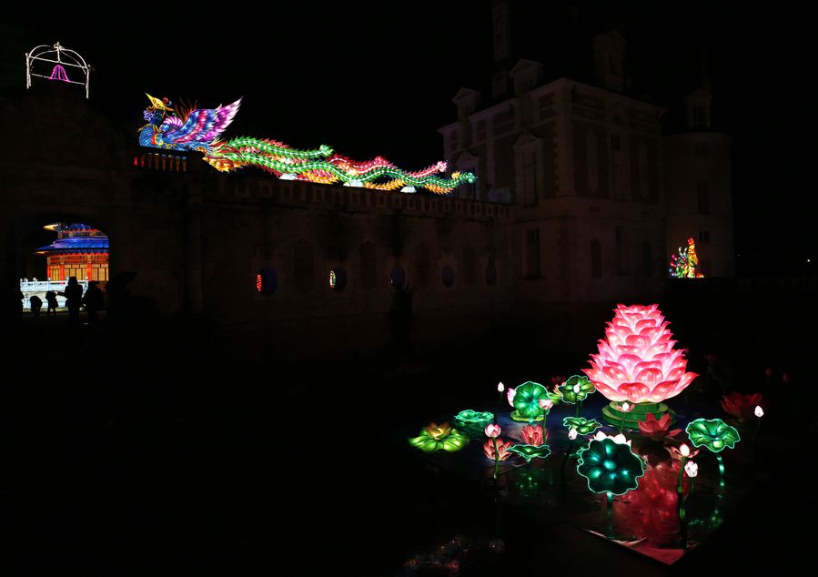 A light installation from Zigong, a city in southwest China's Sichuan Province, is seen during the Chinese Lantern Festival at the Castle of Selles sur Cher, 228 kilometers south of Paris, France, Dec. 15, 2019. (Xinhua/Gao Jing)