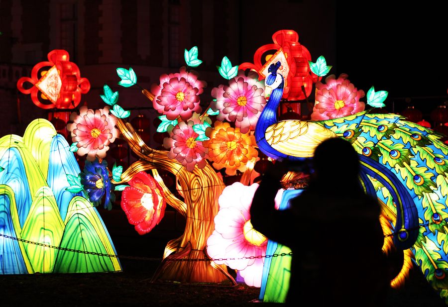 A visitor takes photos of a light installation from Zigong, a city in southwest China's Sichuan Province, during the Chinese Lantern Festival at the Castle of Selles sur Cher, 228 kilometers south of Paris, France, Dec. 15, 2019. (Xinhua/Gao Jing)
