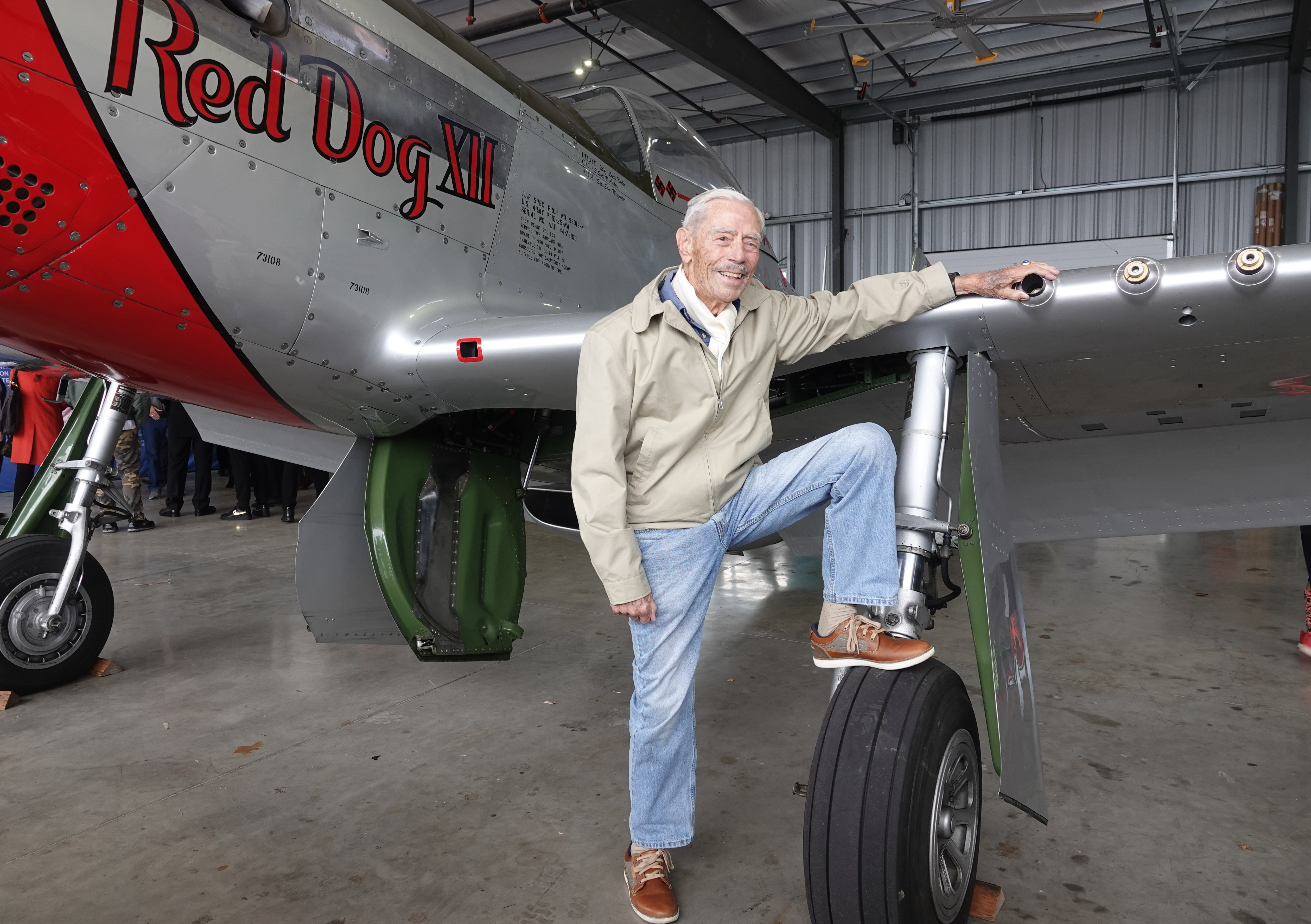 Harry Moyer, a 99-year-old veteran Flying Tigers member, poses for photos with an old plane during an event honoring contributions of Flying Tigers in World War II (WWII) in San Francisco, the United States, Dec. 7, 2019. (Xinhua/Wu Xiaoling)