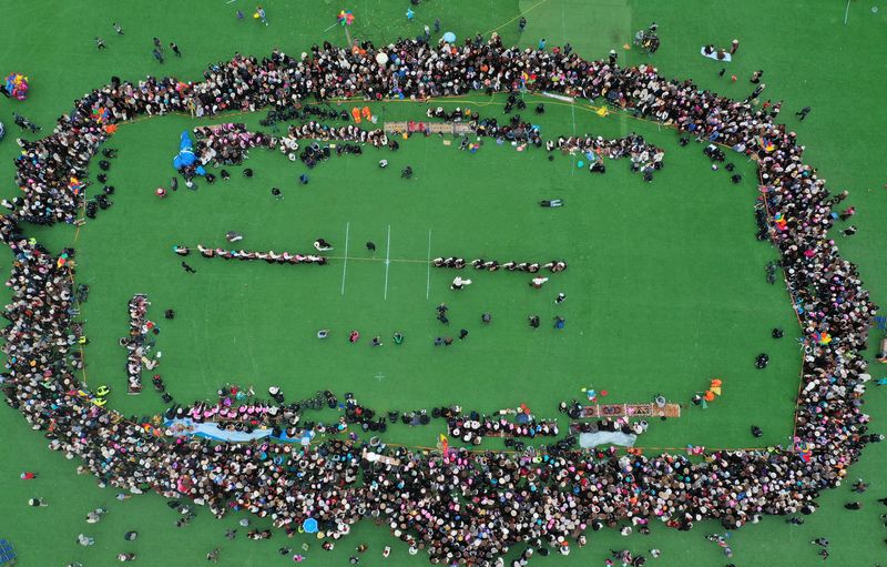 Aerial photo taken on Aug. 9, 2019 shows a tug of war held in Damxung County, southwest China's Tibet Autonomous Region. (Xinhua/Wang Jianhua)