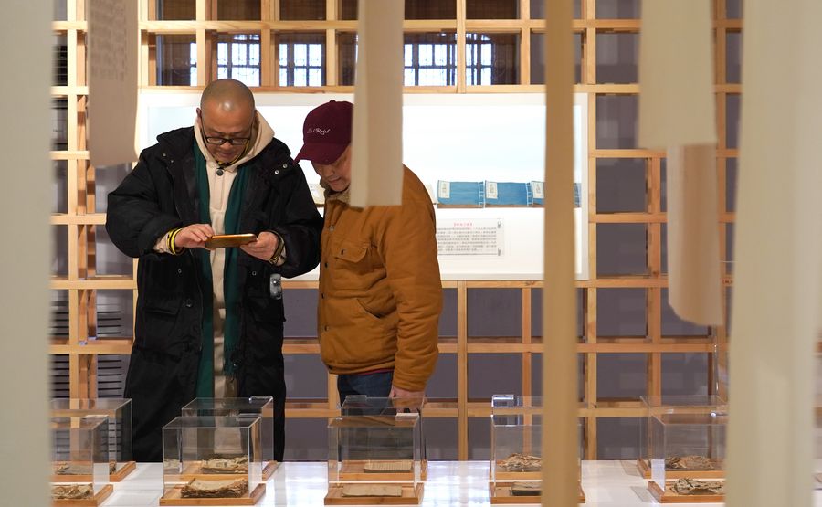 Two visitors are taking photos at China's first museum on antique book repairing, an endangered craft vital to the country's huge inventory of ancient texts, Dec. 26, 2019. (Xinhua/Wang Xi)