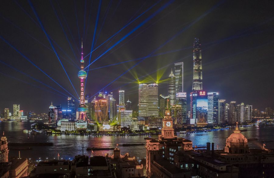 Aerial photo taken on Sept. 26, 2019 shows a light show at Lujiazui area in Pudong District of east China's Shanghai. (Xinhua/Ren Long)