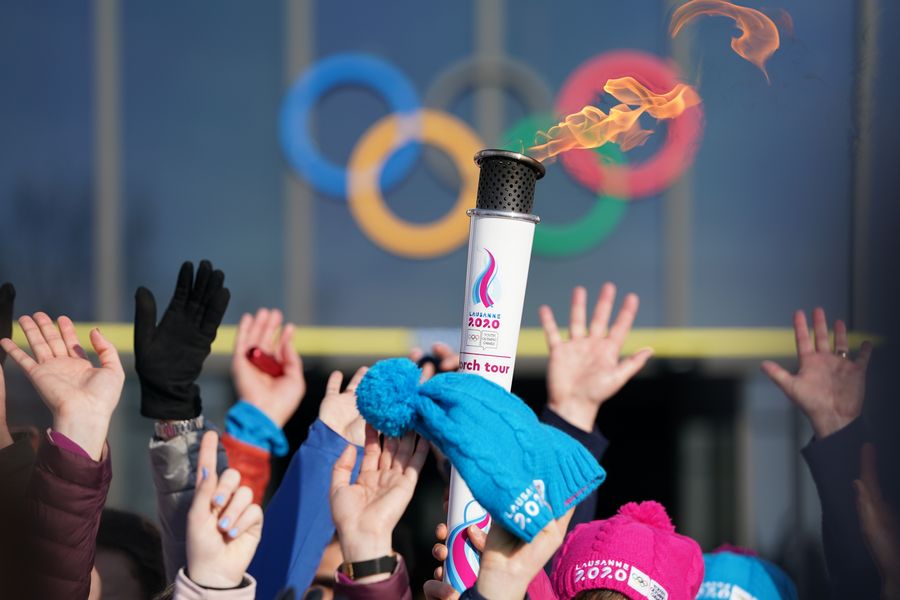 Photo taken on Jan. 8, 2020 shows a view of the torch relay for the 3rd Youth Winter Olympic Games in Lausanne, Switzerland. (Xinhua/Wang Jianwei)
