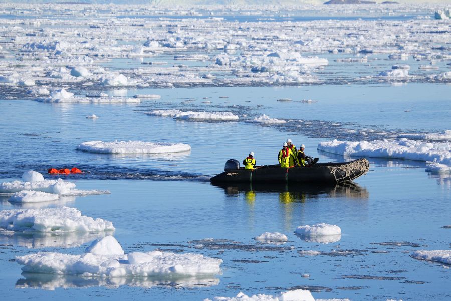 Members of China's 36th Antarctic expedition team collect buoys in the Cosmonauts Sea, Dec. 3, 2019. (Xinhua/Liu Shiping)