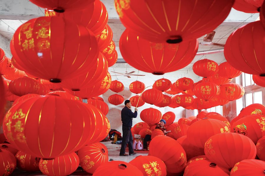 Villagers make and arrange red lanterns in Tuntou Village of Gaocheng District in Shijiazhuang City, north China's Hebei Province, Jan. 7, 2020. As the Spring Festival approaches, lantern manufacturers in Gaocheng, which is known for its lantern production, are busy making red lanterns. (Xinhua/Xing Guangli)