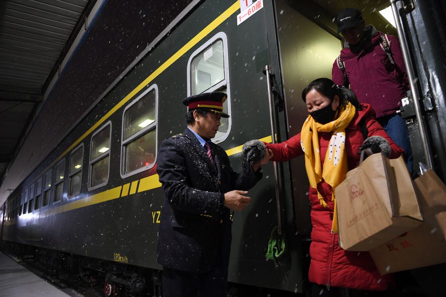 Train conductor Qiu Shuping helps passengers get off the train No. 7505 at the Yongdeng Railway Station in northwest China's Gansu Province, Jan. 10, 2020. (Xinhua/Ma Ning)