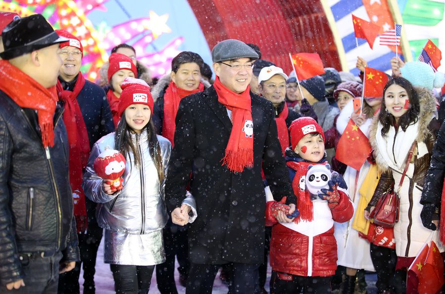 In heavy snow fall, Huang Ping, the Chinese consul general in New York, stood in the front of the cheering crowd, holding the hands of Bing Dwen Dwen, the mascot of the Beijing Winter Olympics, and Shuey Rhon Rhon, the mascot of the Beijing Winter Paralympics.