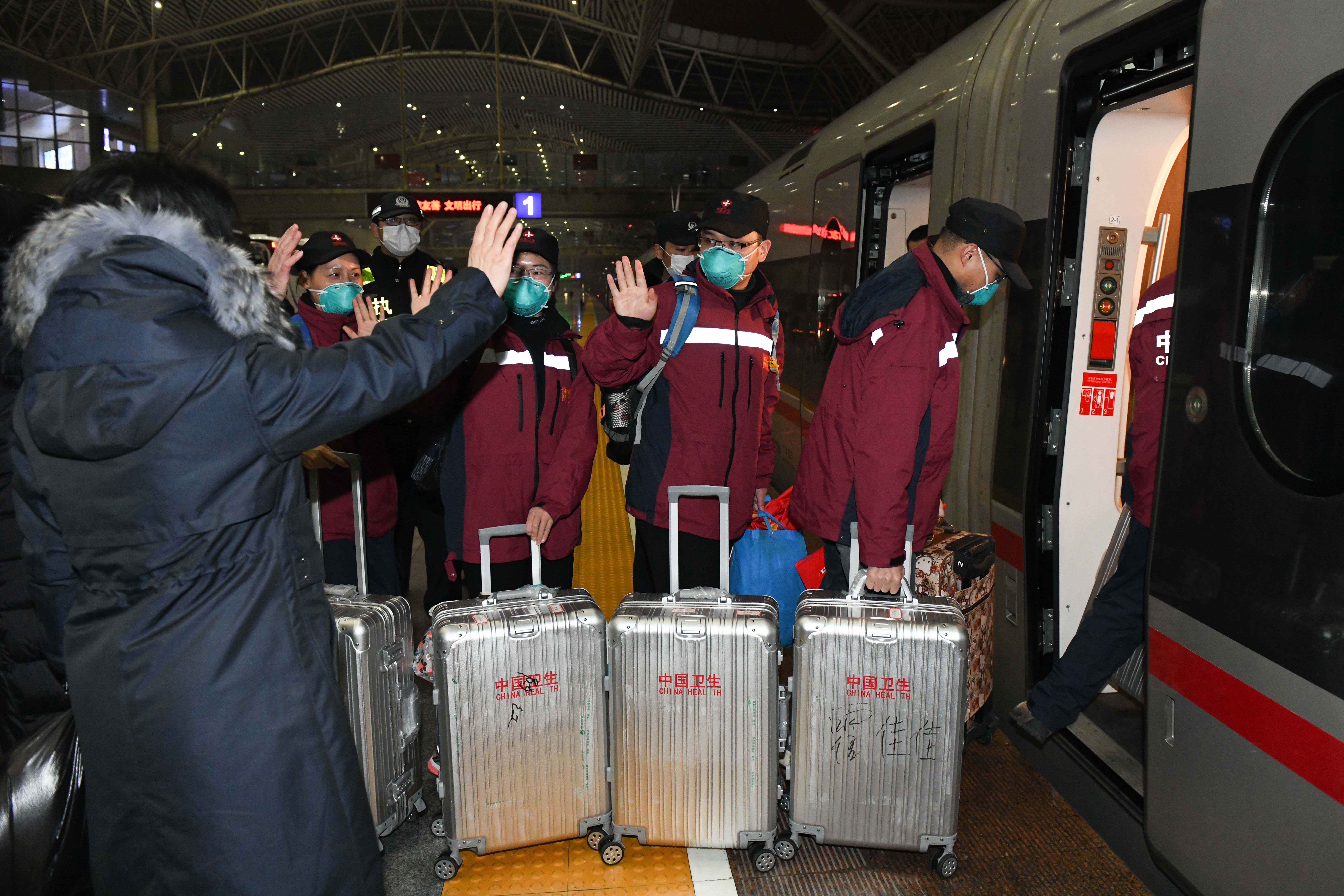 Medical team members take the train to Hubei Province in Hefei, east China's Anhui Province, Jan. 27, 2020. (Xinhua/Zhang Duan)