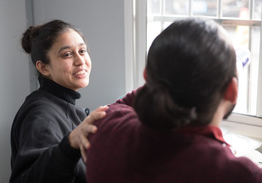 Mauritian Hosany Sumayyah (L) chats with her husband Pakistani Abdul Zahir Hamad during lunch time at a novel coronavirus prevention-and-control checkpoint of an expressway exit in Wenzhou, east China's Zhejiang Province, Feb. 8, 2020.(Xinhua/Weng Xinyang)