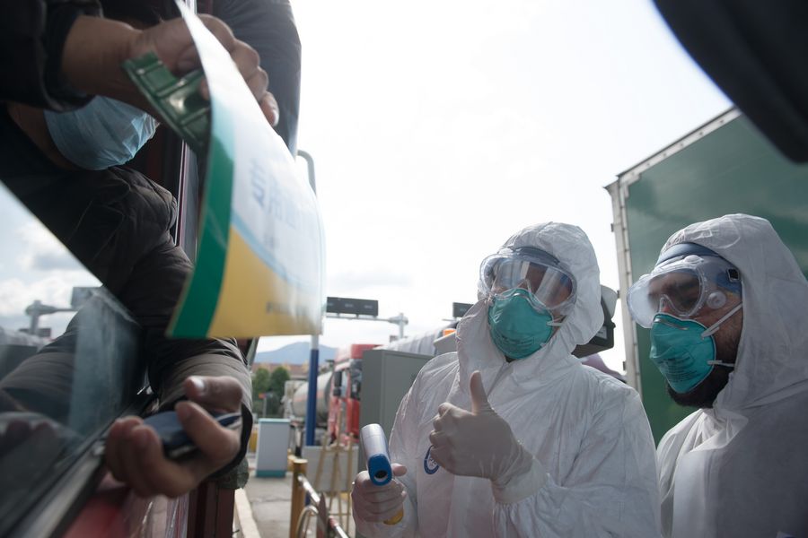 Mauritian Hosany Sumayyah measures body temperature for a driver at a novel coronavirus prevention-and-control checkpoint of an expressway exit in Wenzhou, east China's Zhejiang Province, Feb. 8, 2020.(Xinhua/Weng Xinyang)