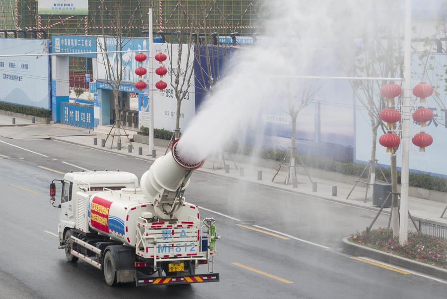 A truck spraying disinfectant on the street of Wuhan, Hubei Province, Feb. 8, 2020. (Xinhua/Cai Yang)