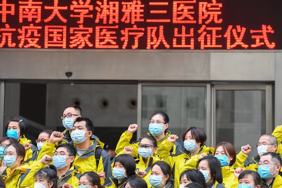 Medical team members swear an oath before setting off at the Third Xiangya Hospital of Central South University in Changsha, central China's Hunan Province, Feb. 8, 2020. Medical workers of the third batch from the Second Xiangya Hospital of Central South University and the first batch from the Third Xiangya Hospital of Central South University set off for Wuhan on Saturday, the Chinese Lantern Festival, to aid the novel coronavirus control efforts there. (Xinhua/Chen Zeguo)
