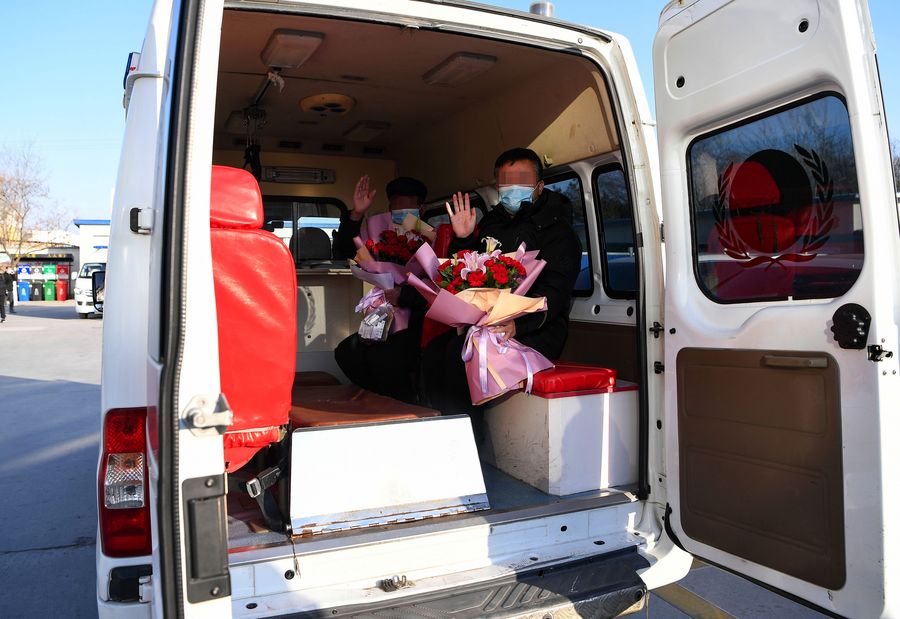 Cured patients leave the Fourth People's Hospital of Ningxia Hui Autonomous Region in Yinchuan, capital of the region, Feb. 8, 2020. Ten patients of the novel coronavirus pneumonia were cured and discharged from the hospital in Ningxia on Saturday. (Xinhua/Feng Kaihua)
