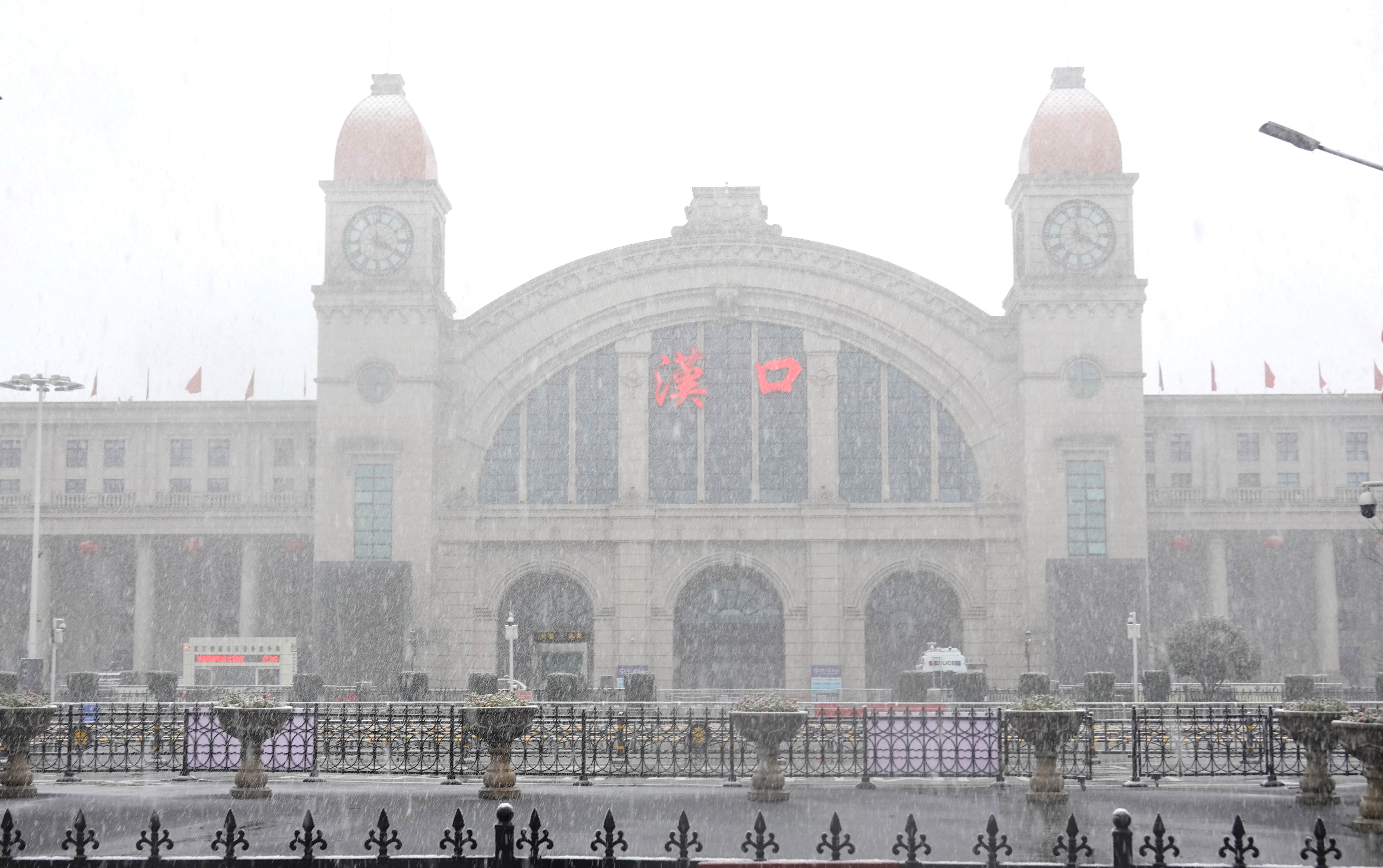 Hankou Railway Station is seen in the snowfall in Wuhan, central China's Hubei Province on Feb. 15, 2020. (Xinhua/Cai Yang)