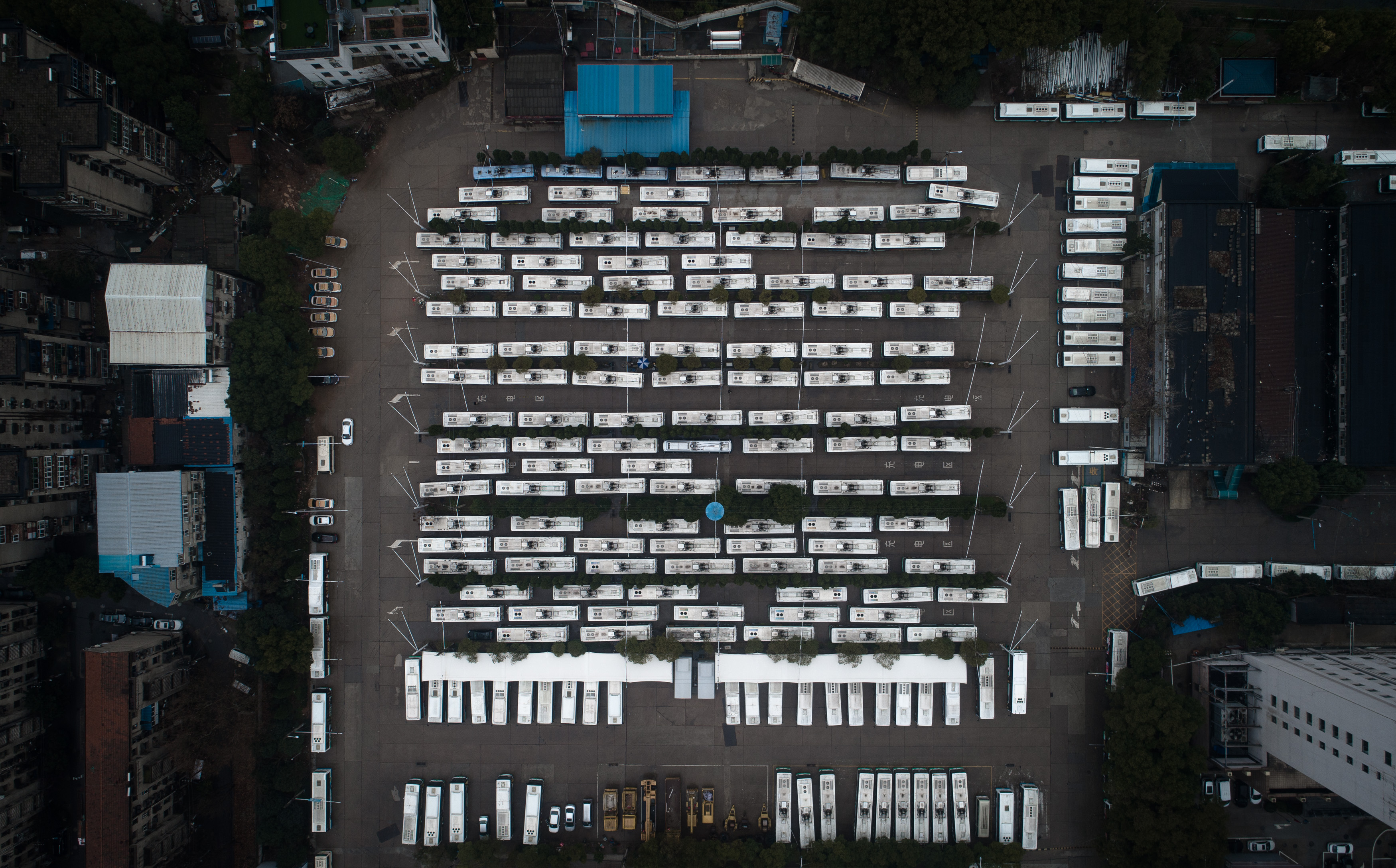Aerial photo taken on Feb. 14, 2020 shows buses at a parking lot in Wuhan, central China's Hubei Province. (Xinhua/Xiao Yijiu)