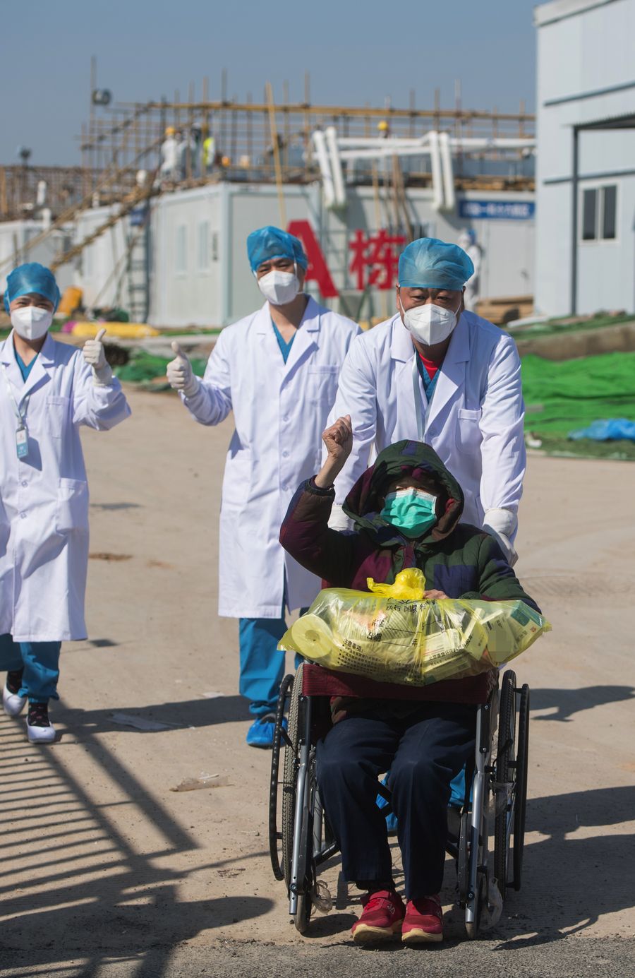 A 83-year-old cured patient waves goodbye to medical workers at the Leishenshan (Thunder God Mountain) Hospital in Wuhan, capital of central China's Hubei Province, Feb. 18, 2020.(Xinhua/Xiao Yijiu)