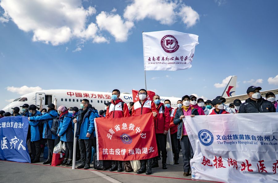 Medical team members attend a ceremony before leaving for Hubei Province at Changshui International Airport in Kunming, capital of southwest China's Yunnan Province, Feb. 19, 2020. (Xinhua/Jiang Wenyao)