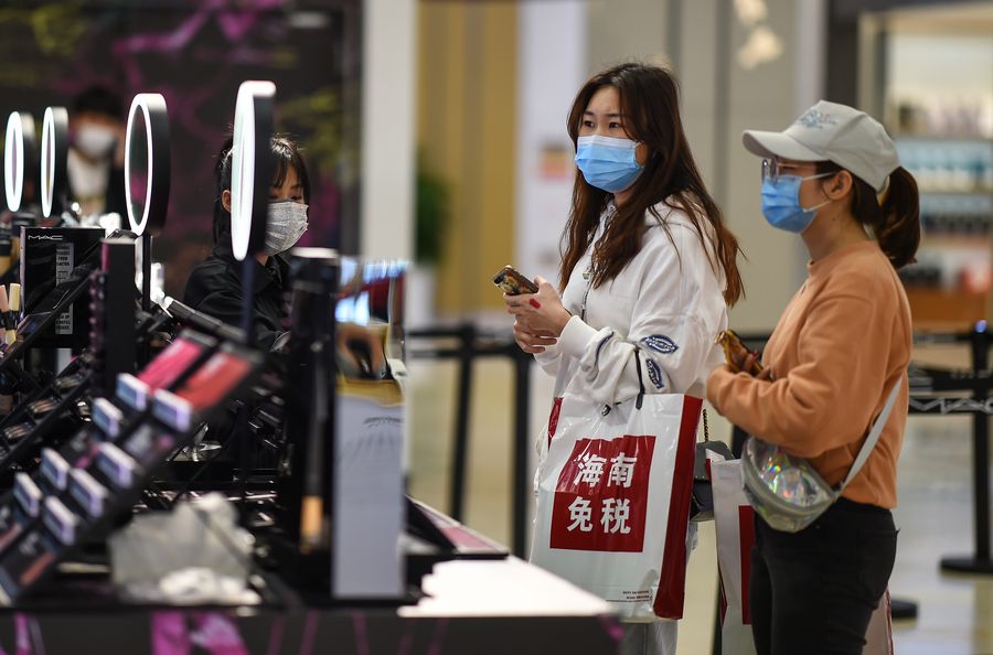 Customers visit the duty-free shop in Haikou, south China's Hainan province, Feb. 20, 2020. (Photo by Pu Xiaoxu/Xinhua)