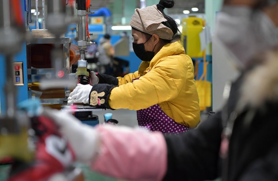 Workers make shoes at a shoemaking factory in Xiangtang Town of Nanchang County, east China's Jiangxi Province, Feb. 22, 2020. Many companies here that rely on exports have resumed production. (Xinhua/Peng Zhaozhi)