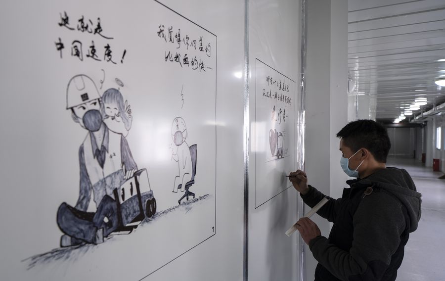 Xu Xinyan, a worker from China Construction Third Engineering Bureau Co., Ltd., draws on the wall of a corridor at the Leishenshan (Thunder God Mountain) Hospital in Wuhan, central China's Hubei Province, March 4, 2020. (Xinhua/Fei Maohua)