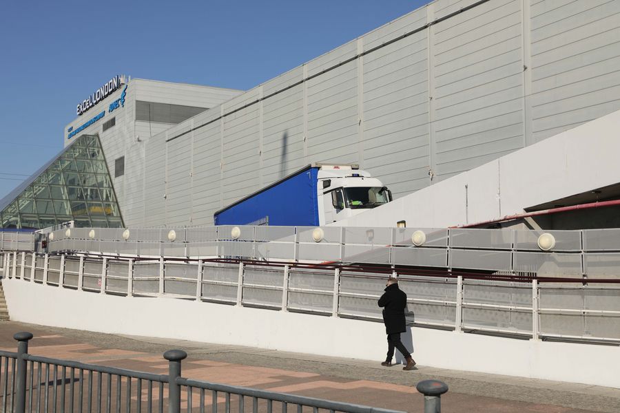 A van drives outside the ExCel exhibition centre in London, Britain, March 25, 2020. (Photo by Tim Ireland/Xinhua)