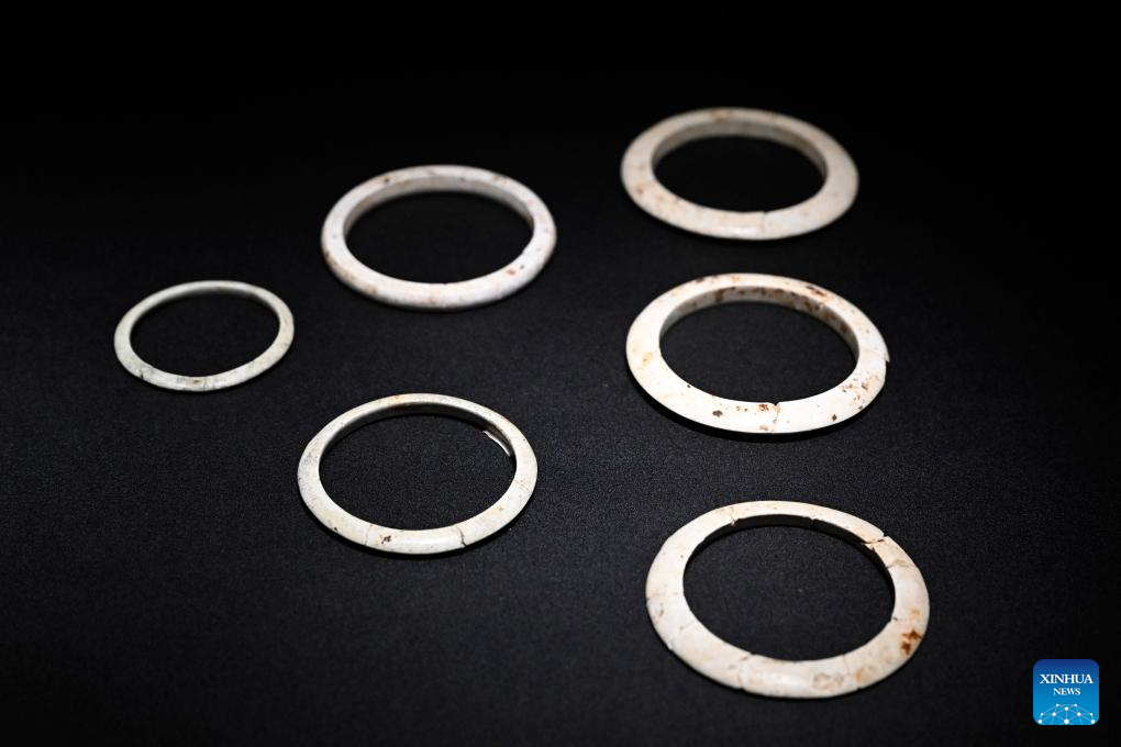 This photo taken on Dec. 24, 2025 shows jade bracelets on display at the Lingjiatan Site Museum in Hanshan County, Ma'anshan, east China's Anhui Province. Dating back some 5,300 to 5,800 years, the Lingjiatan relic site in east China's Anhui was discovered in 1985. It is known for the jadeware unearthed there. The findings include jade artifacts in various shapes, offering a peek into the spirits and aesthetics of a prehistoric Chinese jade culture. (Xinhua/Huang Bohan)